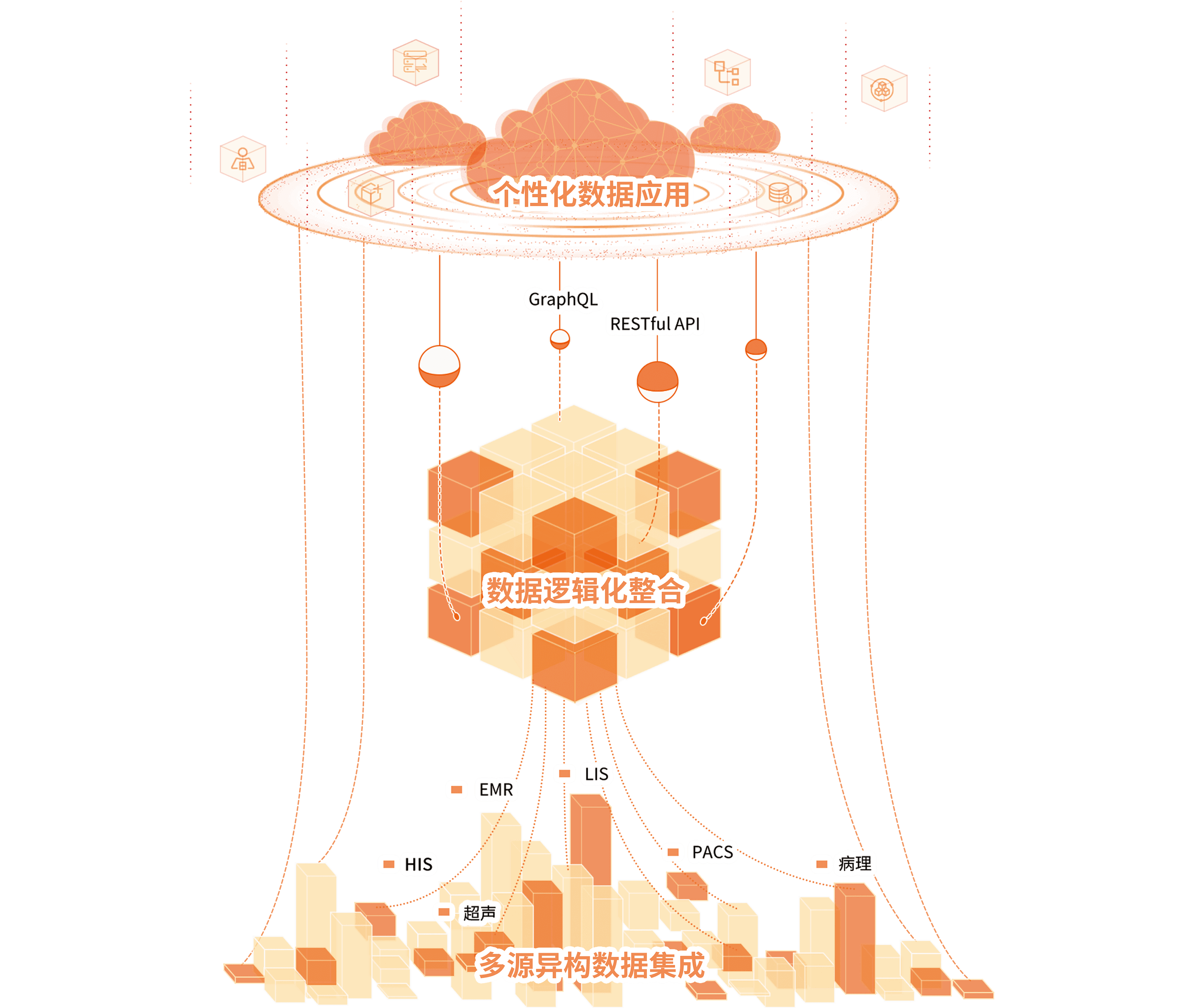 醫(yī)眾醫(yī)療數(shù)據(jù)服務采用 Data Fabric 數(shù)據(jù)編織的架構理念,幫助用戶應對在數(shù)據(jù)資產化進程中產生的復雜性、分布式、多元化等因素,從單純的以數(shù)據(jù)應用為核心建設數(shù)字化,向體系化的數(shù)據(jù)服務能力建設轉型。